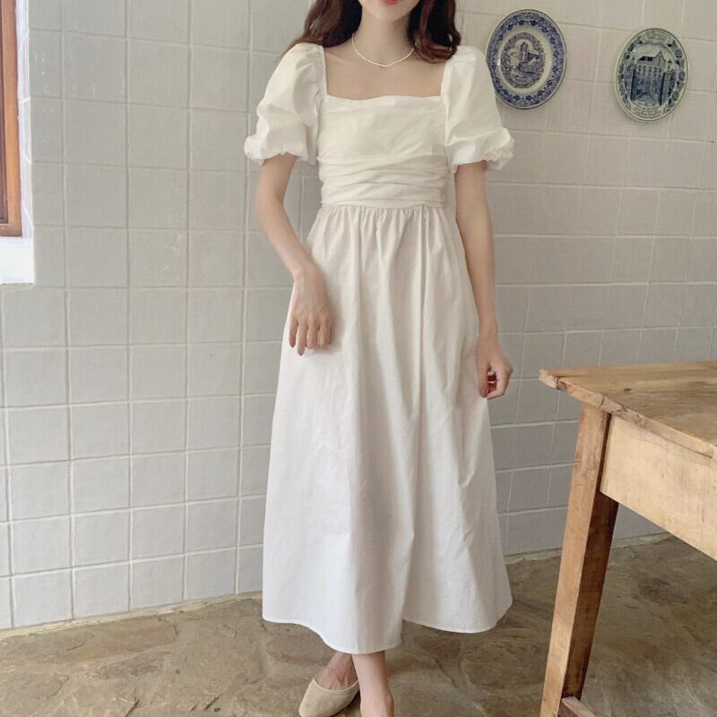 ワンピース ミディ丈 袖あり 半袖 パフスリーブ ハイウエスト ギャザー かわいい 大人可愛い きれいめ カジュアル 上品 おしゃれ レトロ キュート ガーリー エレガント フェミニン 無地 春 夏 10代 20代 30代 40代 レディース デート お出かけ 女子会 休日 着回し 普段使い 韓国系 オルチャン ファッション コーデ スタイル モテ 体型カバー トレンド ワンサイズ 白 ホワイト | ATAOI