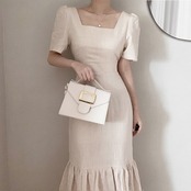 ワンピース ワンピドレス 膝下 ロング丈 袖あり 半袖 スクエアネック スリム マーメイド 裾フリル ウエストリボン バックリボン 後ろファスナー シンプル 大人 おしゃれ 上品 エレガント スマート フォーマル 無地 20代 30代 40代 レディース オルチャンファッション デート お出かけ 休日 パーティー イベント ホテル レストラン モテファッション S M L サイズ レッド ベージュ | ATAOI