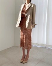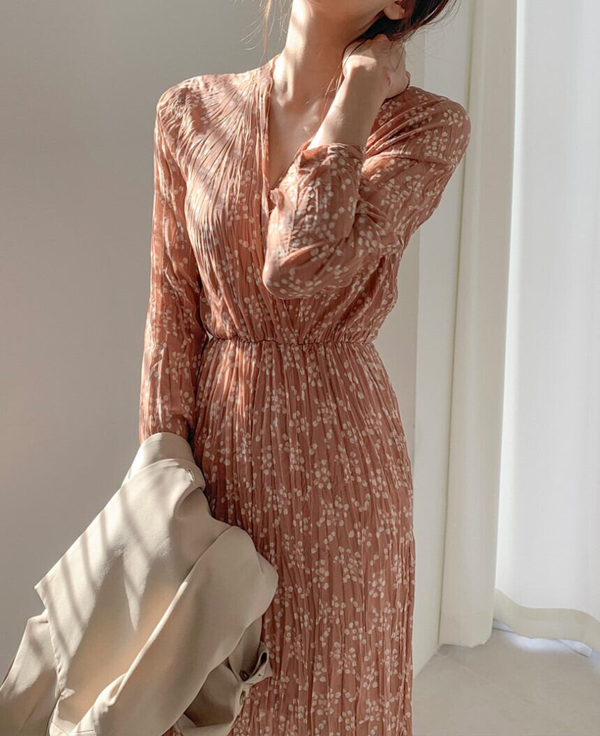 大人かわいいシフォンワンピース。細かなプリーツとVネックで女性らしいシルエットに。