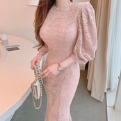 ロングドレス フィッシュテールドレス ワンピース ロング丈 袖あり 七分袖 五分袖 パフスリーブ ボリューム袖 ラウンドネック 裾フリル タイト 美スタイル 細身 レース きれいめ おしゃれ 上品 大人女子 こなれ感 フェミニン 大人 セクシー 個性的 透け感 春 秋 イベント ホテル フォーマル パーティー デート エレガント 存在感 主役級 20代 30代 40代 S M L サイズ ピンク | ATAOI