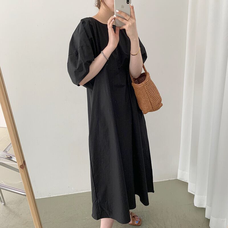 ワンピース ミディアム丈 半袖 パフスリーブ 薄手 かわいい シンプル カジュアル おしゃれ お洒落 こなれ感 ラフ エレガント 無地 夏 20代 30代 40代 レディース デート お出かけ 公園デビュー 休日 リゾート 旅行 海 ショッピング 普段使い 韓国 韓国系 ファッション 楽ちん サイズ ワンサイズ 色展開 ブラック アプリコット ライトブルー | ATAOI
