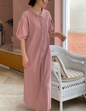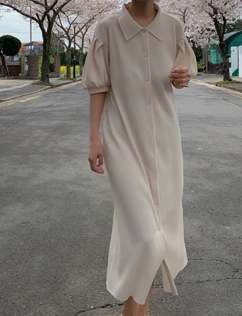 ワンピース ロング丈 袖あり 半袖 パフスリーブ 襟付き ポロ襟 前ボタン 大人可愛い きれいめ シンプル カジュアル 上品 クラッシック レトロ 大人女子 こなれ感 フェミニン 無地 春 夏 秋 10代 20代 30代 40代 レディース デート お出かけ ショッピング 休日 旅行 公園 着回し 普段使い 韓国系 オルチャン ファッション 楽ちんコーデ スタイル 体型カバー ゆったり ワンサイズ カラー アプリコット ピンク | ATAOI