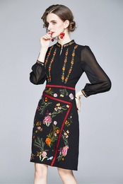 ワンピース 膝丈 ひざ丈 膝上 袖あり 長袖 スタンドカラー 立ち襟 スリム 細身 ハイウエスト 透け感 大人可愛い きれいめ 大人 上品 おしゃれ お洒落 エキゾチック 華やか 大人女子 個性的 セクシー エレガント 主役級 存在感 抜け感 フェミニン 柄 花柄 フラワー 刺繍 春 秋 謝恩会 二次会 レディース 女性用 パーティー 普段使い スタイル 美脚 脚長 M L XL 2XL 黒 ブラック | ATAOI