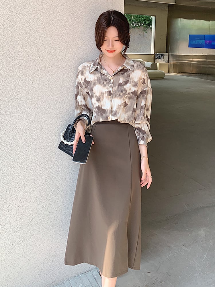 長袖ブラウスとミモレ丈スカートの2点セットです。