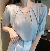 レディース夏の半袖、V ネックシフォンブラウス。オフィスなどに使える。