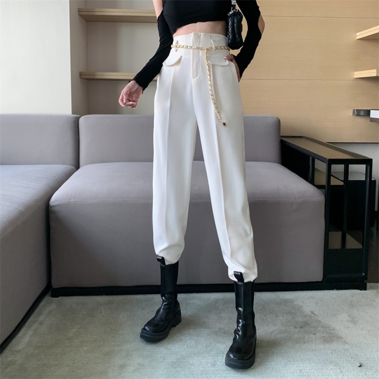センタープレスパンツ ボトムス パンツ ストレート ベルト ハイウエスト チェーンベルト きれいめ シンプル 大人 おしゃれ お洒落 かっこいい 大人女子 クール モード系 足長 無地 春 夏 秋 冬 オールシーズン シーズンレス 10代 20代 30代 レディース 女性用 OL 通勤 学生 通学 お出かけ 女子会 休日 着回し ファッション コーデ スタイル S M L 色展開 白 ホワイト 黒 ブラック | ATAOI