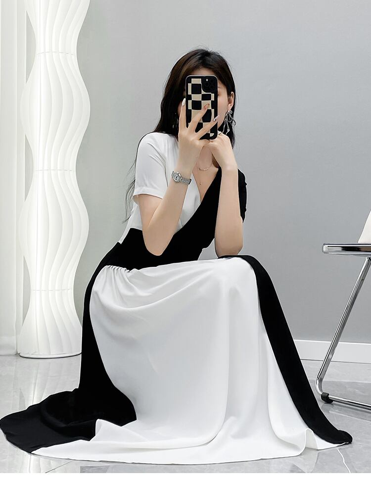 高級感 個性的 ワンピース ロング ロング丈 半袖 Vネック Aライン ウエストマーク 大人可愛い きれいめ シンプル 大人 上品 おしゃれ お洒落 かっこいい 大人女子 こなれ感 個性的 クール エレガント 主役級 存在感 無地 夏 20代 30代 レディース OL 通勤 デート お出かけ 公園 女子会 休日 着回し 普段使い 韓国 韓国系 ファッション スタイル サイズ S M L XL 2XL 3XL 黒 ブラック 白 ホワイト バイカラー モノトーン | ATAOI