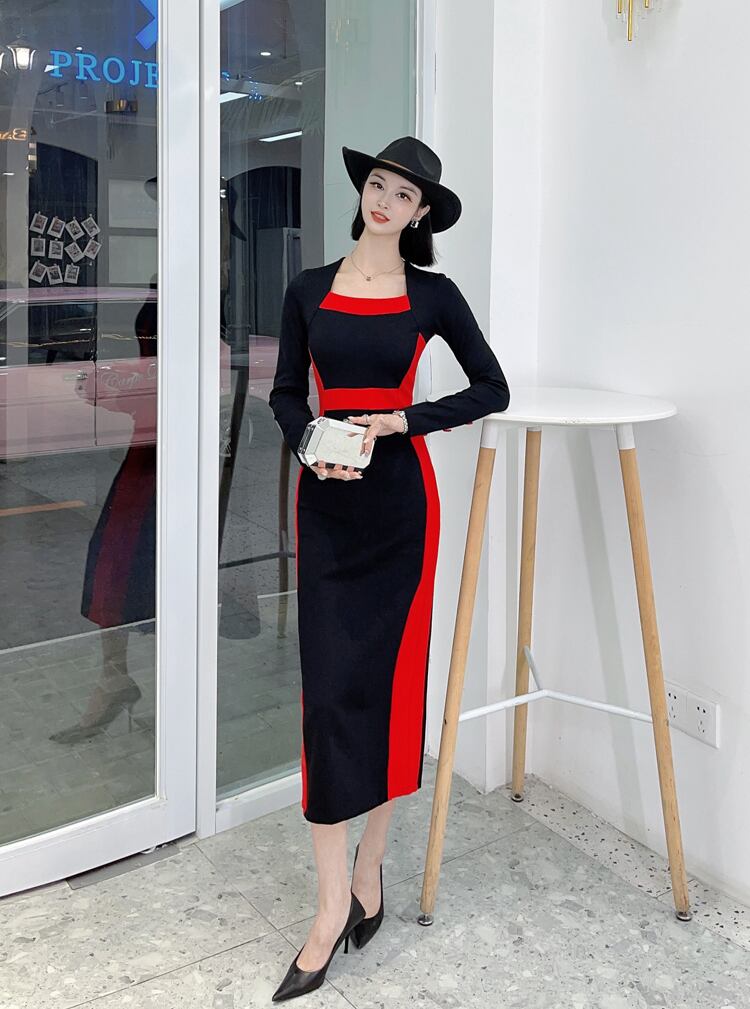ワンピース ミディアム丈ワンピース スリムフィットドレス コントラストカラー タイトフィット 袖あり 長袖 襟なし スクエアネック ウエストマーク 後ろファスナー モダン クール かっこいい おしゃれ 大人女子 無地 秋 冬 イベント 20代 30代 40代 レディース 女性用 もてなし デート コスチューム お出かけ 休日 パーティー レストラン ホテル クリスマス オルチャンファッション コーデ トレンド サイズ M L XL カラー ホワイト レッド | ATAOI