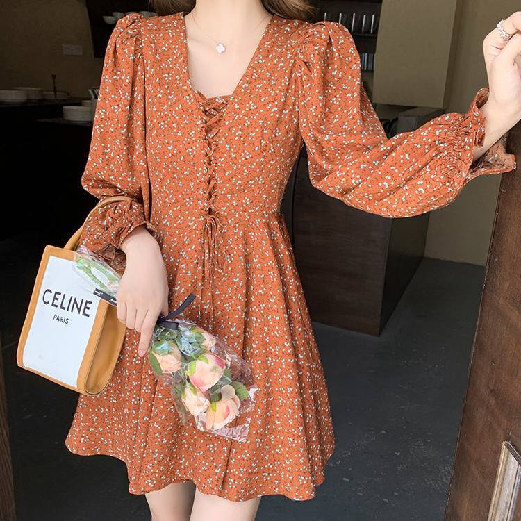 ワンピース フレアワンピース ミニ ミニ丈 袖あり 長袖 パフスリーブ Vネック フレア Aライン フリル リボン ハイウエスト かわいい 大人可愛い きれいめ シンプル 上品 おしゃれ お洒落 華やか ラブリー キュート ガーリー エレガント 抜け感 フェミニン ロマンチック ロリータ 柄 花柄 小花柄 フラワー 春 秋 レディース 女性用 デート お出かけ 女子会 普段使い 韓国系 モテ 体系カバー 美脚 脚長 2色展開 赤 レッド アプリコット | ATAOI