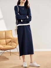 トップス スカート ボトムス セットアップ ミモレ ミモレ丈 袖あり 長袖 ラウンドネック ストレート 2点セット ツーピース 上下セット きれいめ シンプル カジュアル 大人 おしゃれ お洒落 大人女子 こなれ感 ラフ 春 秋 冬 2022 2023 学生 通学 お出かけ 休日 旅行 普段使い ファッション コーデ スタイル 楽ちん S M L XL 2XL ネイビー | ATAOI