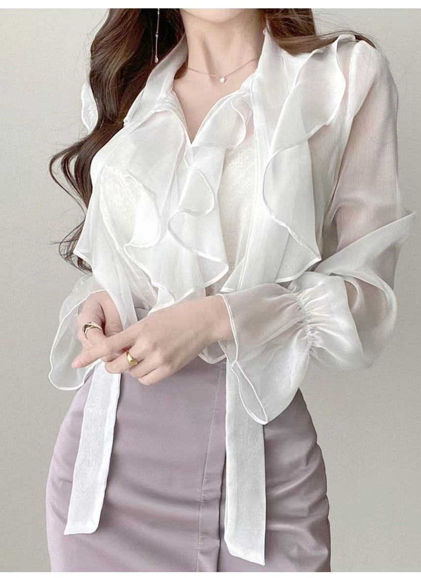 たっぷりとあしらわれたフリルが大人可愛い印象の長袖ブラウスです。