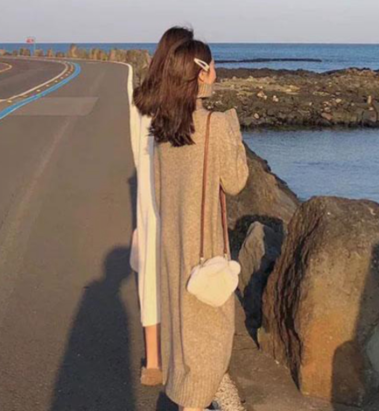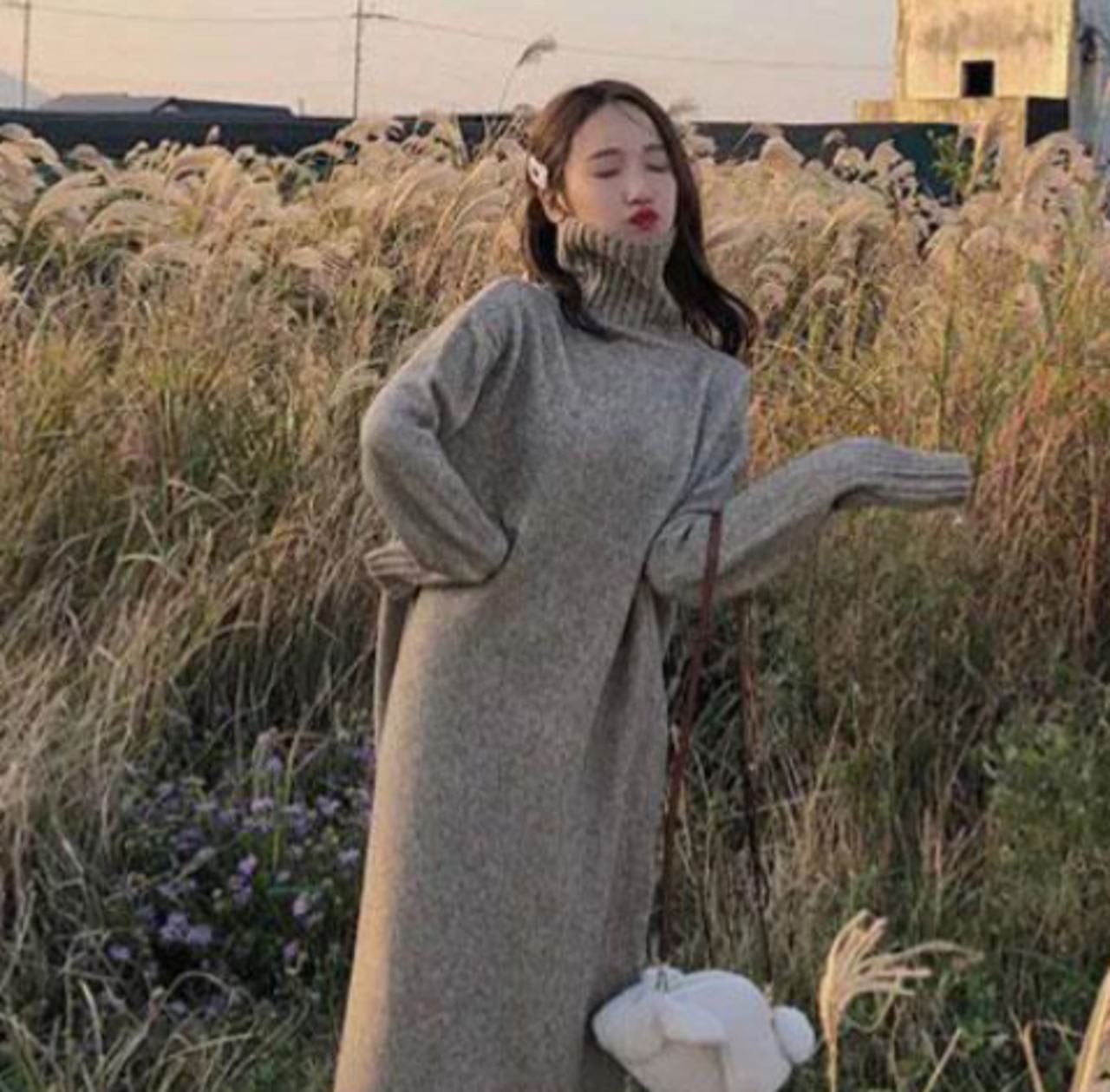 ストンと落ちるIラインシルエットのタートルネックニットワンピースです。