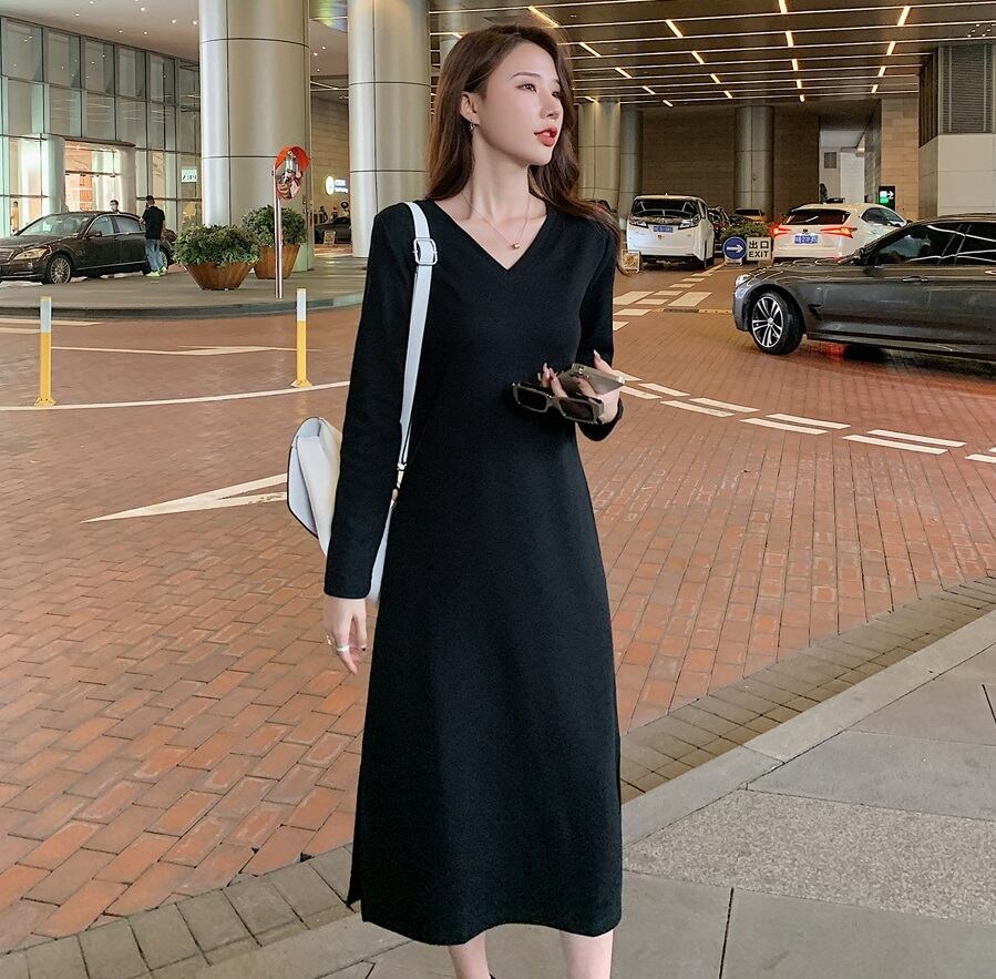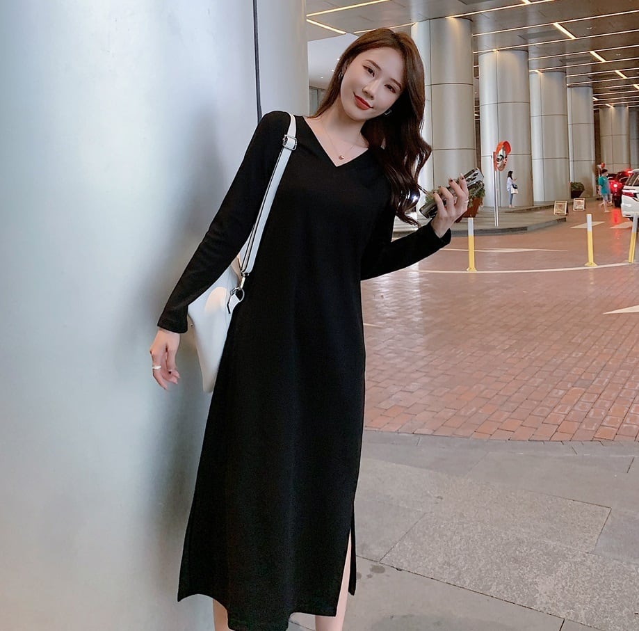 ワンピース 膝下 ロング ロング丈 袖あり 長袖 Vネック Iライン スリット サイドスリット かわいい シンプル カジュアル おしゃれ お洒落 大人可愛い こなれ感 無地 秋 10代 20代 30代 40代 レディース 女性用 学生 通学 お出かけ 女子会 お泊まり 休日 普段使い ファッション スタイル 楽ちん デイリー サイズ M L XL 2XL 3XL 4XL 色展開 黒 ブラック 灰色 グレー | ATAOI