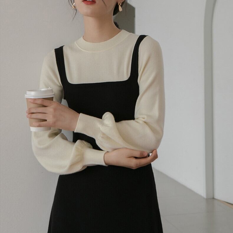 トップスとドッキングしたようなデザインのニットのロングワンピース。