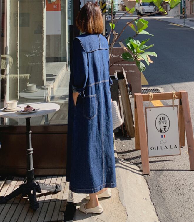 韓国風マキシ丈デニムワンピースでゆったり着心地よい。