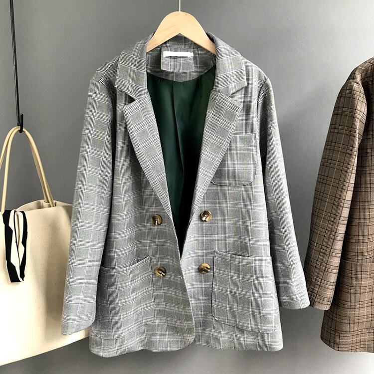 トップス ジャケット ダブルボタン 格子縞 レギュラー丈 袖あり 長袖 襟あり スーツ襟 Vネック ポケット ボタン 前開き ルーズフィット ゆったり レトロ 柄 大人可愛い ベーシック おしゃれ クール モダン 大人女子 シンプル カジュアル 春 秋 冬 イベント 10代 20代 30代 40代 レディース 女性用 OL 通勤 通学 学生 休日 お出かけ デート ショッピング レストラン ホテル オルチャンファッション カジュアルコーデ トレンド サイズ S M カラー グレー ブラウン | ATAOI