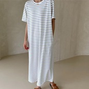 ワンピース シャツ シャツワンピース ロング ロング丈 袖あり 半袖 襟なし プルオーバー かわいい 大人可愛い きれいめ 上品 おしゃれ お洒落 こなれ感 ラフ 個性的 存在感 柄 ボーダー 春 夏 秋 20代 30代 40代 50代 60代 レディース 女性用 OL 通勤 学生 通学 デート お出かけ 女子会 休日 ジム 着回し 普段使い お揃い 双子 コーデ スタイル 楽ちん S M L XL | ATAOI