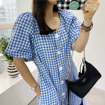 ボリューム感あるバルーンスリーブが特徴のギンガムチェックワンピース。