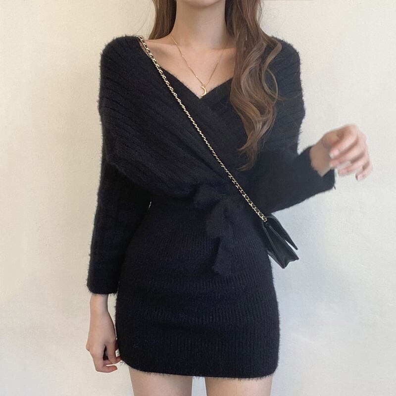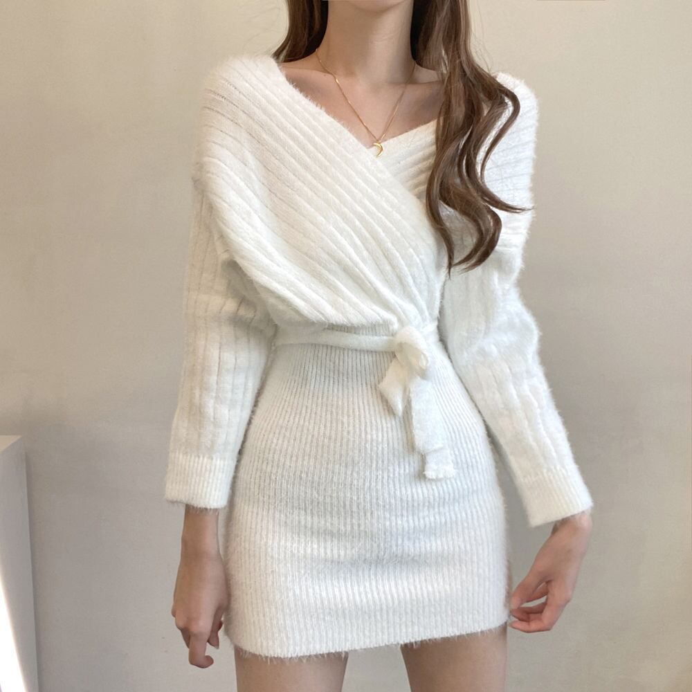 ニットワンピース スカート ワンピース ニットソー セーター ミニスカート ニットスカート ミニ丈 袖あり 長袖 Vネック スリム タイト ウエストマーク ウエストリボン ふわふわ かわいい 大人可愛い きれいめ シンプル カジュアル 大人 おしゃれ 大人女子 こなれ感 キュート ガーリー セクシー エレガント 無地 秋 冬 10代 20代 30代 レディース 通学 デート お出かけ 女子会 休日 イベント 旅行 レストラン 普段使い 韓国 フリーサイズ アプリコット ホワイト ブラック | ATAOI