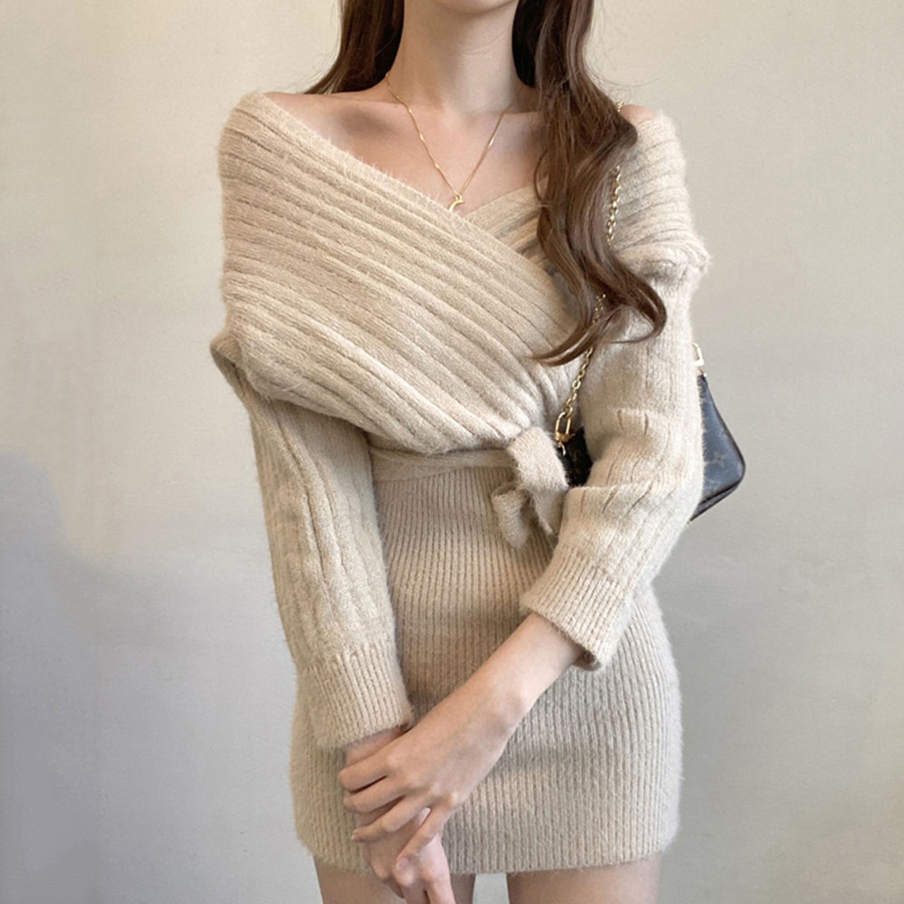 大人可愛いミニ丈のニットワンピース。