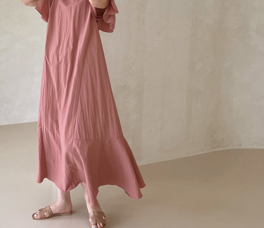 シックなピンクがおしゃれなマキシ丈ワンピ。