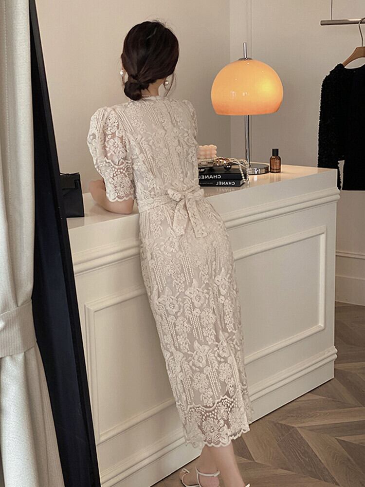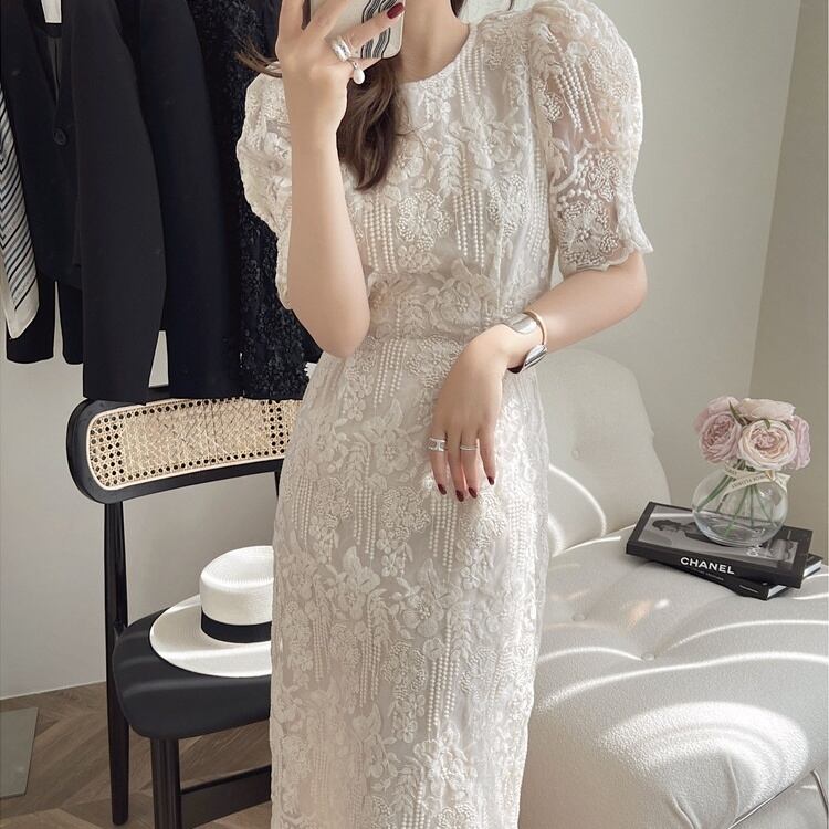 ワンピース ワンピドレス ロング丈 袖あり 半袖 パフスリーブ ラウンドネック 襟なし Aライン レース ウエストリボン 透け感 かわいい 大人可愛い きれいめ シンプル カジュアル 大人 上品 おしゃれ かっこいい レトロ 大人可愛い 大人女子 こなれ感 セクシー モダン 柄 フラワー 春 秋 10代 20代 30代 レディース 女性用 通勤 学生 通学 デート お出かけ 女子会 休日 着回し 普段使い 韓国系 コーデ スタイル S M L XL ホワイト | ATAOI