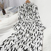 ワンピース 膝下 ロング ロング丈 袖あり 長袖 ボウタイ フレア ウエストゴム かわいい おとなかわいい きれいめ 上品 おしゃれ お洒落 大人可愛い 大人女子 きれいめ 柄 春 秋 20代 30代 レディース 女性用 デート お出かけ 女子会 パーティー イベント ファッション モテ フリーサイズ 色展開 白 ホワイト 黒 ブラック | ATAOI