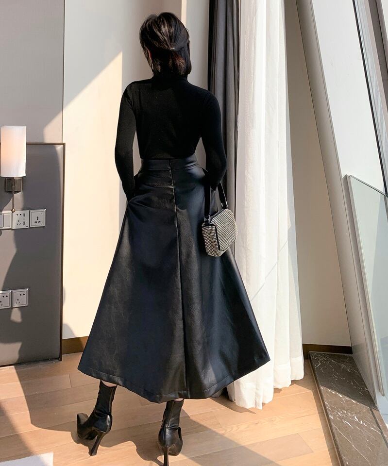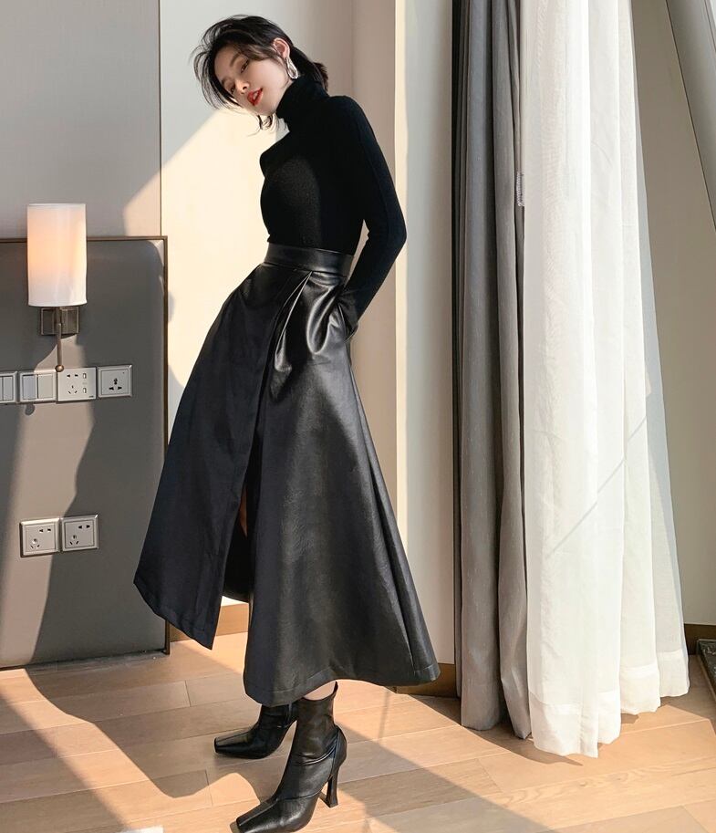 フェイクレザー ボトムス スカート 膝下 ロング ロング丈 フレア Aライン ハイウエスト スリット サイドスリット PU 大人 おしゃれ お洒落 大人女子 クール モード系 無地 秋 冬 10代 20代 30代 レディース 女性用 学生 通学 デート お出かけ 女子会 着回し ファッション サイズ S M L XL 黒 ブラック | ATAOI