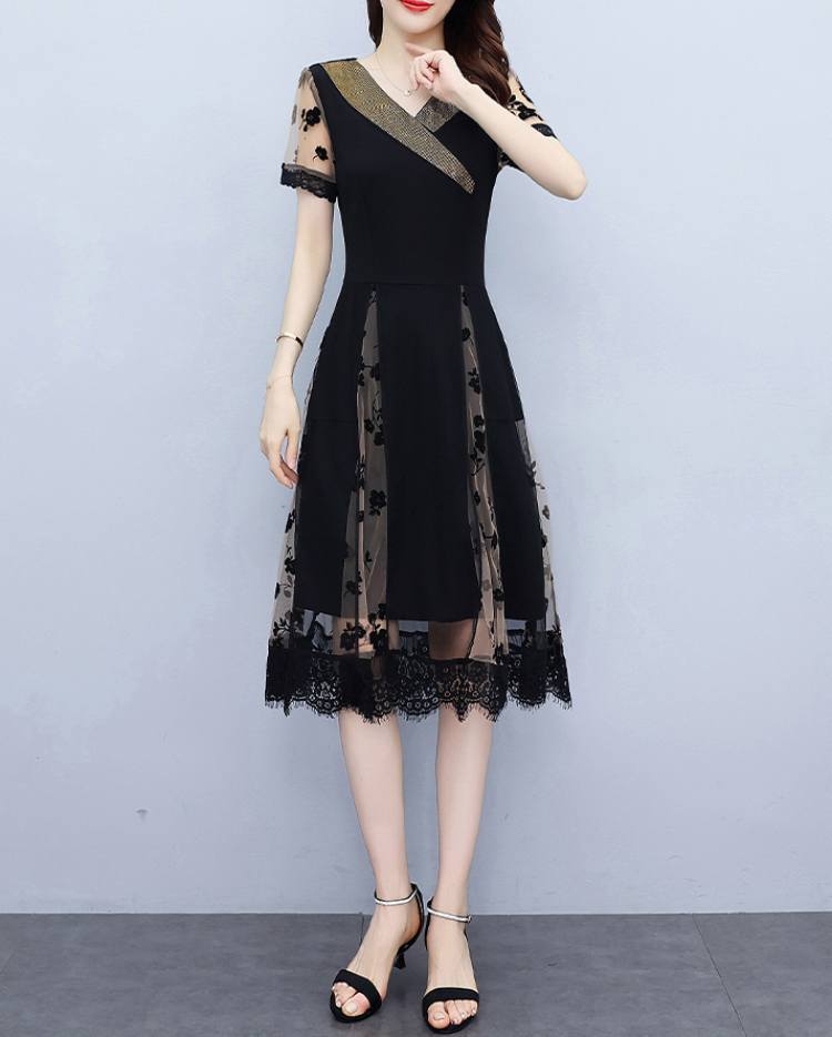 ワンピース フレアワンピース 膝丈 ひざ丈 膝下 半袖 Vネック フレア Aライン レース 刺繍 ハイウエスト 透け感 シースルー かわいい 大人可愛い きれいめ 大人 上品 おしゃれ お洒落 清潔感 大人女子 こなれ感 ラブリー キュート 個性的 エレガント 抜け感 フェミニン 華やか 花柄 フラワー 春 夏 謝恩会 二次会 20代 30代 レディース 女性用 デート お出かけ 女子会 パーティー 脚長 大きいサイズ 大きめ ビッグサイズ プラスサイズ 黒 ブラック | ATAOI