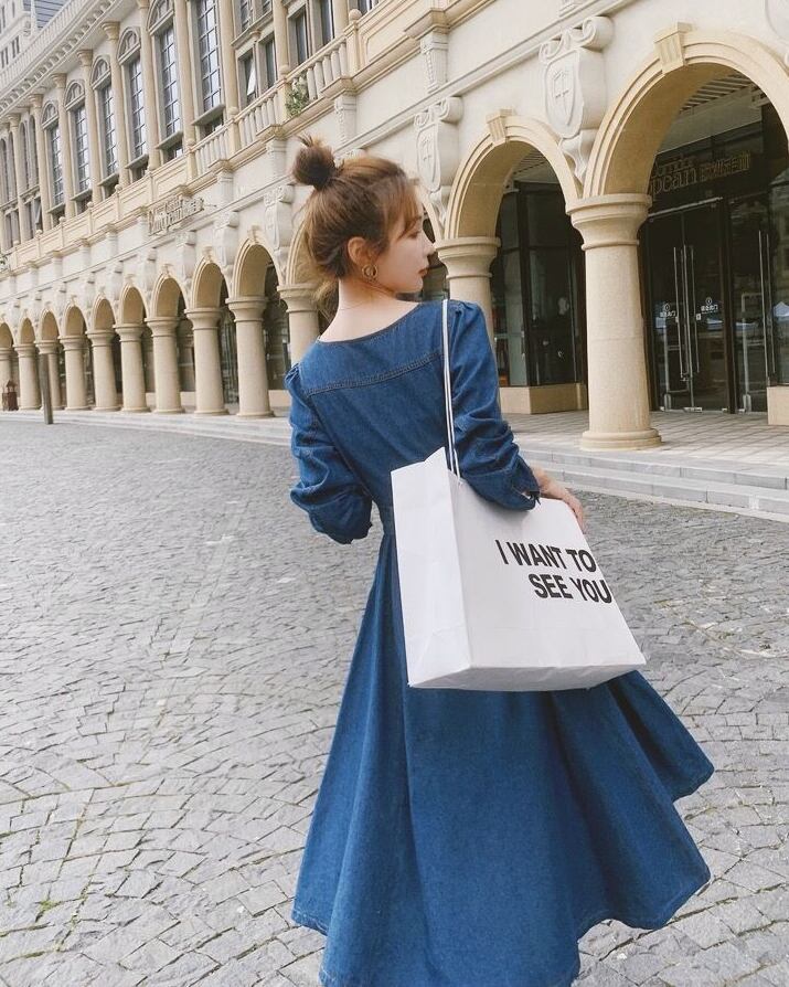 ワンピース デニムスカート フレアワンピース デニムワンピース ミモレ ミモレ丈 袖あり 長袖 スクエアネック フレア セミフレア 大人可愛い きれいめ 大人 おしゃれ お洒落 ラブリー キュート ガーリー 無地 春 秋 2022 2023 10代 20代 30代 レディース 女性用 女の子 学生 通学 デート お出かけ 女子会 休日 旅行 普段使い ファッション コーデ スタイル S M L 青 ブルー | ATAOI