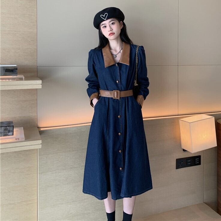 ワンピース ミモレ丈ワンピース 膝丈ワンピース Aラインワンピース カジュアルワンピース ミモレ ミモレ丈 袖あり 長袖 Vネック 襟付き Aライン 切り替えデザイン ベルト ウエストマーク ハイウエスト 腰ポケット デニム かわいい 大人可愛い シンプル カジュアル おしゃれ お洒落 レトロ 存在感 キュート 無地 10代 20代 30代 レディース 女性用 女の子 学生 通学 お出かけ 女子会 秋 冬 S M L XL 2XL 3XL 4XL 5XL 青 ブルー | ATAOI