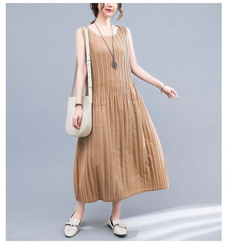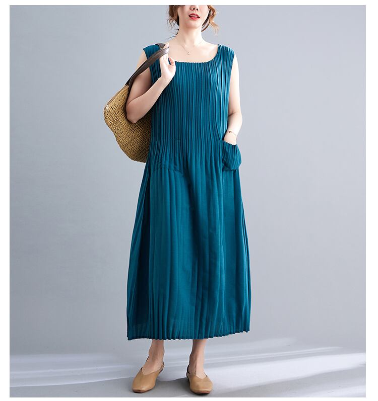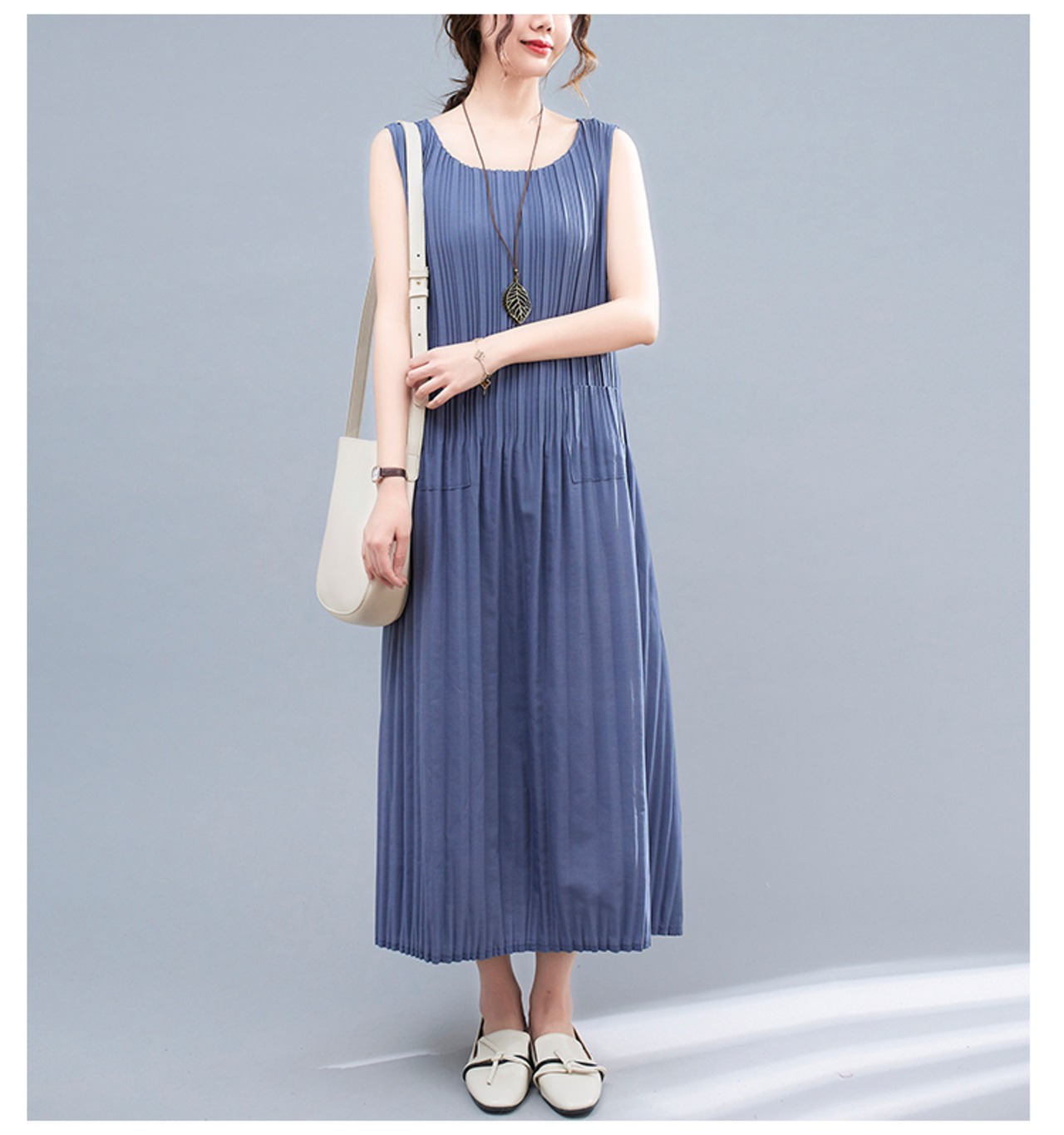 ワンピース ノースリーブ クルーネック ミモレ丈 ロング ラウンドネック 袖なし 襟なし ポケット ルーズフィット プリーツ 楽ちん レトロ 大人 シンプル シック おしゃれ カジュアル 無地 春 夏 秋 10代 20代 30代 40代 レディース 女子用 イベント 通勤 通学 学生 OL デート 休日 お出かけ 普段使い ショッピング レストラン ホテル 旅行 オルチャンファッション カジュアルコーデ トレンド サイズ L XL 2XL ゆったりサイズ グレー ブルー カーキ スカイブルー | ATAOI