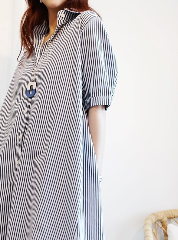 ワンピース シャツワンピース ロング丈 袖あり 五分袖 パフスリーブ 襟あり ポロ襟 Vネック 前ボタン ルーズフィット 楽ちん レトロ 大人可愛い かわいい シンプル ふんわり おしゃれ キュート カジュアル ストライプ柄 春 夏 10代 20代 30代 40代 レディース 女子用 イベント 学生 OL 通勤 通学デート 休日 お出かけ ショッピング レストラン リゾート ホテル 旅行 パーティー オルチャンファッション カジュアルコーデ トレンド サイズ S M L XL カラー 色 ブルー ホワイト | ATAOI