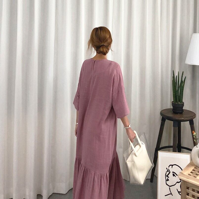 ワンピース ロングワンピース ロング丈 フリルスカート 袖あり 七分袖 レギュラースリーブ 襟なし ラウンドネック プルオーバー ルーズフィット 体型カバー 楽ちん 切り替え レトロ 大人可愛い シンプル ふんわり おしゃれ キュート カジュアル 無地 春 秋 10代 20代 30代 40代 レディース 女子用 イベント 学生 OL 通勤 通学 デート 休日 お出かけ ショッピング リゾート ホテル 旅行 オルチャンファッション カジュアルコーデ トレンド サイズ S M L XL カラー 色 ピンク | ATAOI