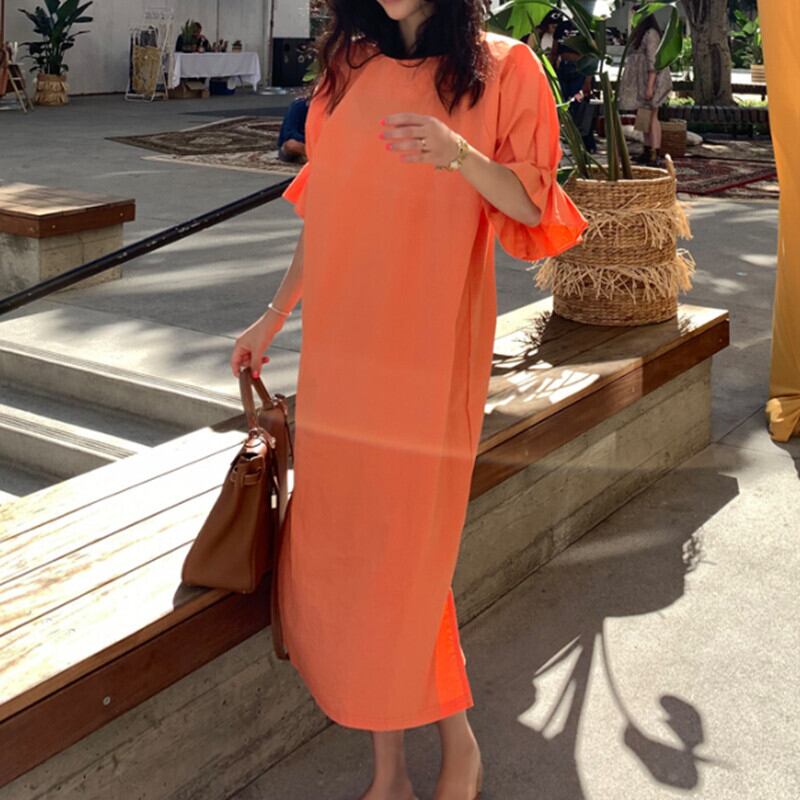 ワンピース ミドル丈ワンピース 横スリット 膝丈 フリルスリーブ 袖あり 五分袖 ランタンスリーブ 襟なし ラウンドネック プルオーバー ルーズフィット 体型カバー 楽ちん レトロ 大人可愛い シンプル ふんわり おしゃれ キュート カジュアル 無地 春 夏 秋 10代 20代 30代 40代 レディース 女子用 イベント 学生 OL 通勤 通学 デート 休日 お出かけ ショッピング リゾート ホテル 旅行 オルチャンファッション カジュアルコーデ トレンド サイズ S M L カラー 色 オレンジ | ATAOI
