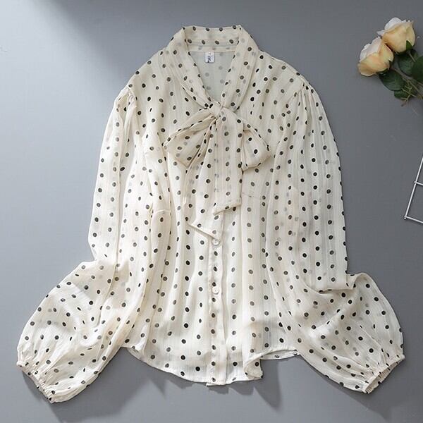 水玉ブラウス トップス ブラウス 白トップス 袖あり 長袖 Vネック シフォン リボン 前開き かわいい 大人可愛い カジュアル おしゃれ お洒落 大人可愛い 大人女子 キュート 個性的 ドット柄 水玉 ボーダー 春 秋 オールシーズン 10代 20代 30代 40代 レディース 女性用 ママ オフィス OL 通勤 学生 通学 デート お出かけ 着回し 普段使い ファッション コーデ スタイル サイズ S M L XL 色展開 白 ホワイト | ATAOI