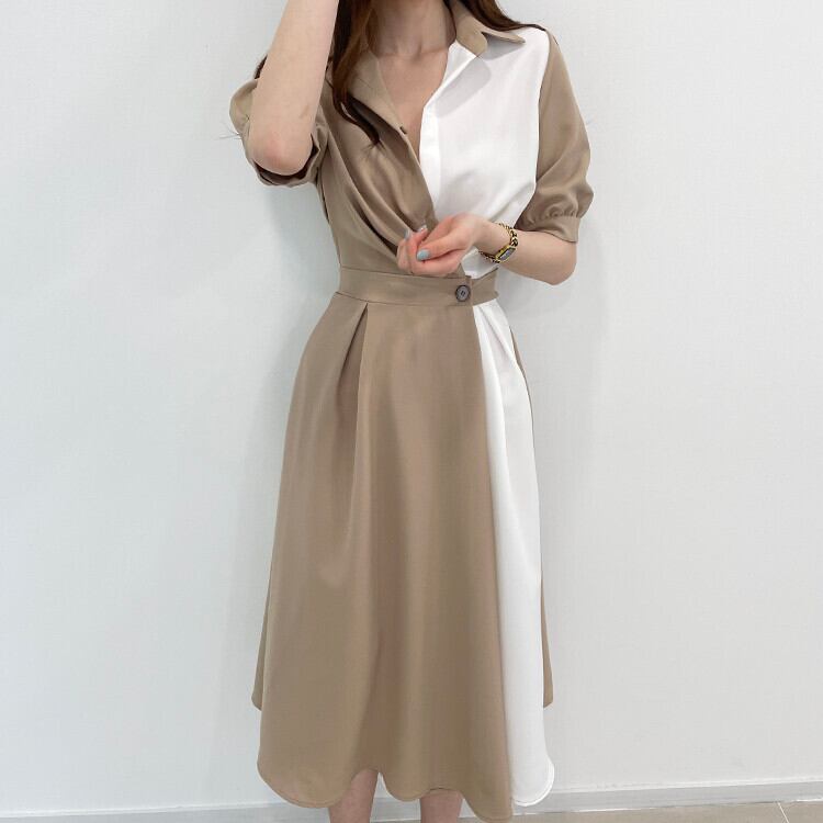 ワンピース シャツワンピース フレアワンピース 膝下 ミモレ ミモレ丈 ミディアム丈 袖あり 5分袖 五分袖 Vネック 襟付き フレア Aライン ウエストマーク ハイウエスト かわいい 大人可愛い きれいめ シンプル 大人 上品 おしゃれ お洒落 清潔感 大人女子 こなれ感 ラブリー キュート ガーリー エレガント モダン 抜け感 フェミニン 無地 春 夏 レディース 女性用 デート お出かけ 女子会 普段使い モテ 美脚 脚長 青 ブルー ベージュ カーキ ネイビー バイカラー 2色展開 | ATAOI