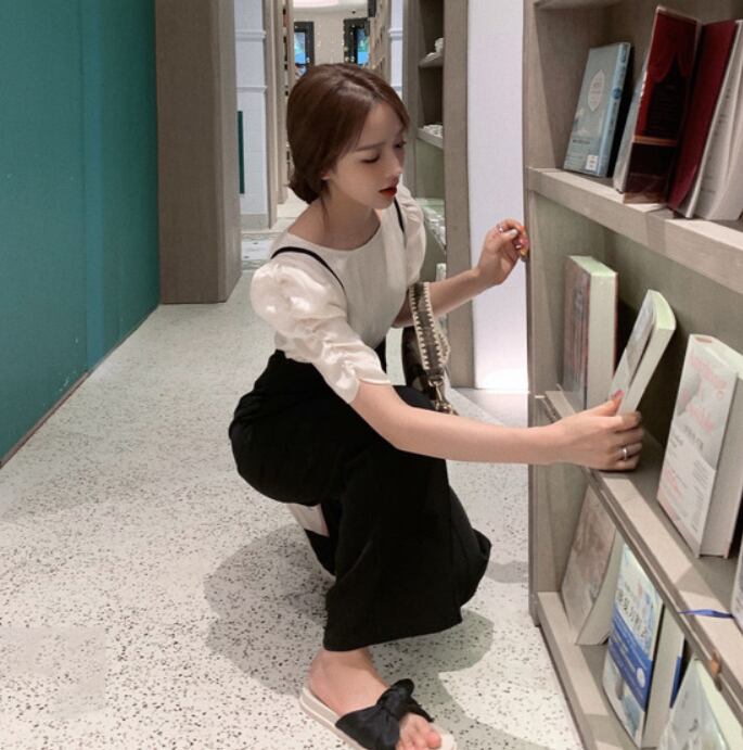 夏にぴったりな韓国風スタイル、パフスリーブのシフォンシャツと
