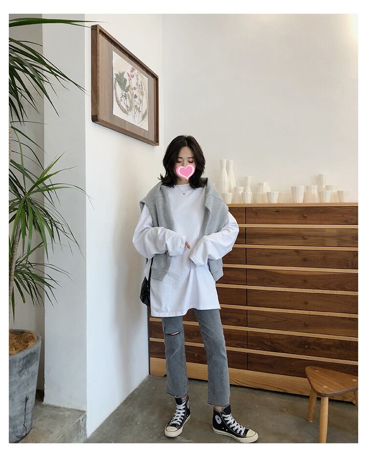 合わせるボトムスや小物を選ばない、万能アイテムの長袖トップスです。