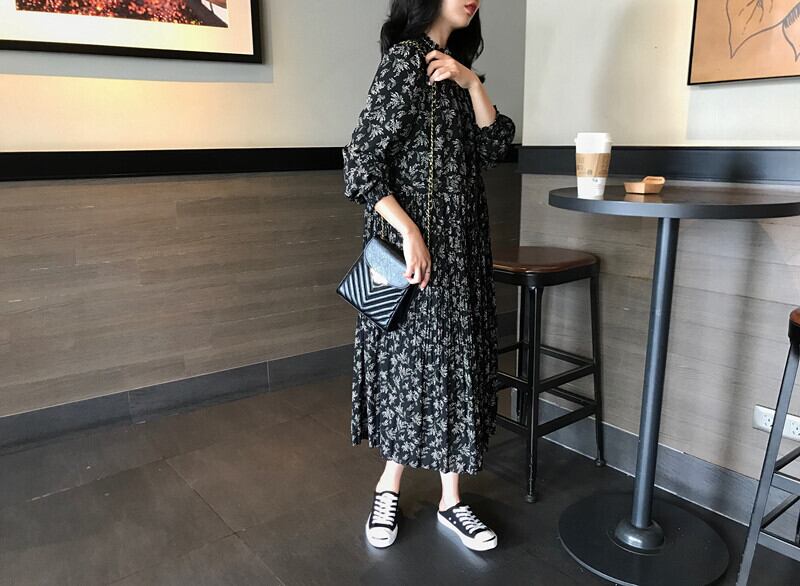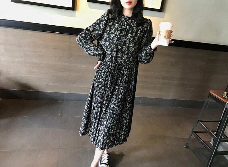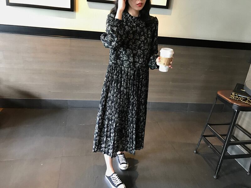ワンピース フレアワンピース ミモレ ミモレ丈 ロング ロング丈 袖あり 長袖 ボリューム袖 ラウンドネック 襟なし スタンドカラー フレア Aライン フリル プリーツ ポリエステル かわいい 大人可愛い カジュアル 大人 おしゃれ お洒落 レトロ 大人女子 ラブリー キュート ガーリー 柄 花柄 小花柄 フラワー 春 秋 10代 20代 30代 レディース 女性用 学生 通学 デート お出かけ 休日 普段使い 韓国 楽ちん モテ S M L XL 2XL 黒 ブラック | ATAOI