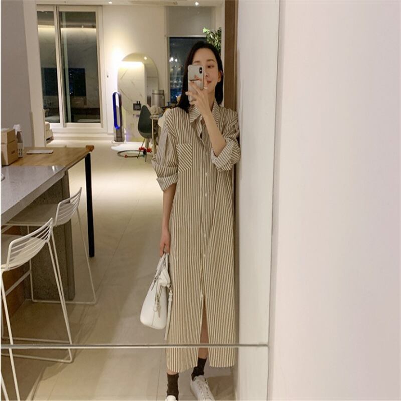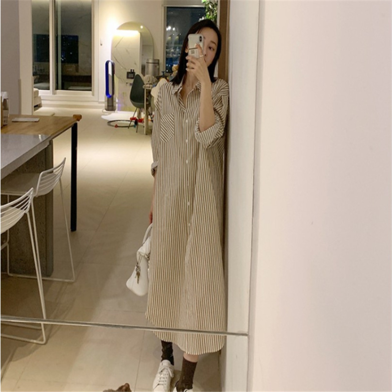 ワンピース シャツワンピース ミモレ ミモレ丈 ロング ロング丈 袖あり 長袖 ボリューム袖 パフスリーブ 襟付き ストレート 前開き 綿 かわいい 大人可愛い シンプル カジュアル 大人 おしゃれ お洒落 大人女子 こなれ感 ラブリー キュート ガーリー 柄 ストライプ シマ 春 秋 10代 20代 30代 40代 50代 60代 レディース 女性用 学生 通学 デート お出かけ 休日 イベント 着回し 普段使い 重ね着 韓国 楽ちん 体系カバー S M L XL ベージュ | ATAOI