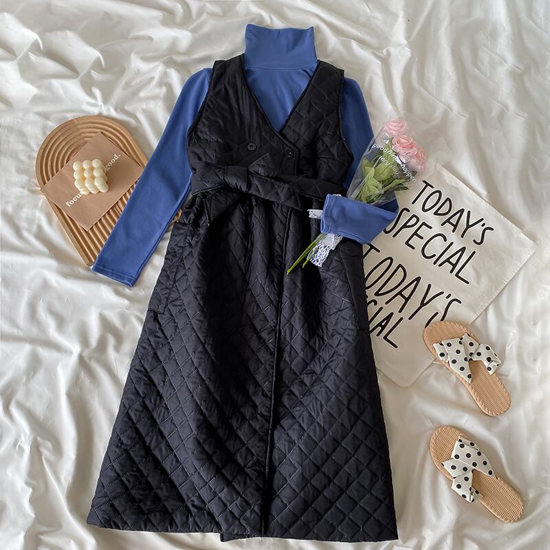 2点セット セットアップ トップス ジャンパースカート Tシャツ 膝下 ミモレ ミモレ丈 袖あり ノースリーブ 長袖 ハイネック ベルト ウエストマーク キルティング ツーピース かわいい おとなかわいい 大人 おしゃれ お洒落 大人可愛い 大人女子 無地 秋 冬 20代 30代 40代 レディース 女性用 通勤 お出かけ 女子会 普段使い 重ね着 ファッション コーデ スタイル サイズ S M L 黒 ブラック 青 ブルー | ATAOI