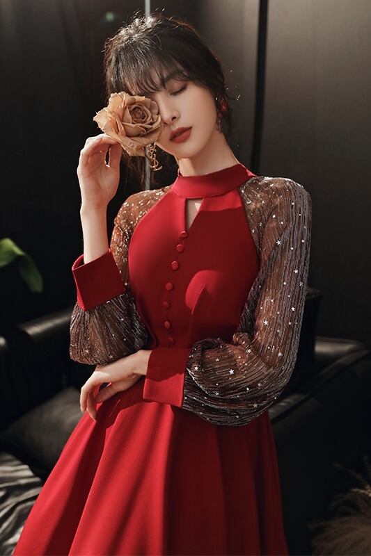 ドレス ワンピース ドレス フレアスカート チュチュスカート ミドル丈 スパンコール 袖あり 長袖 ボタン Uネック ベルト ウエストマーク スリムフィット 無地 セクシー シック 上品 エレガント おしゃれ クール モダン 大人女子 存在感 主役級 春 秋 冬 イベント パーティー 結婚式 20代 30代 40代 レディース 女性用 パーティー ホテル レストラン リゾート オルチャンファッション フォーマルコーデ 小さいサイズ 大きいサイズ S M L XL 2XL カラー レッド ブラック | ATAOI