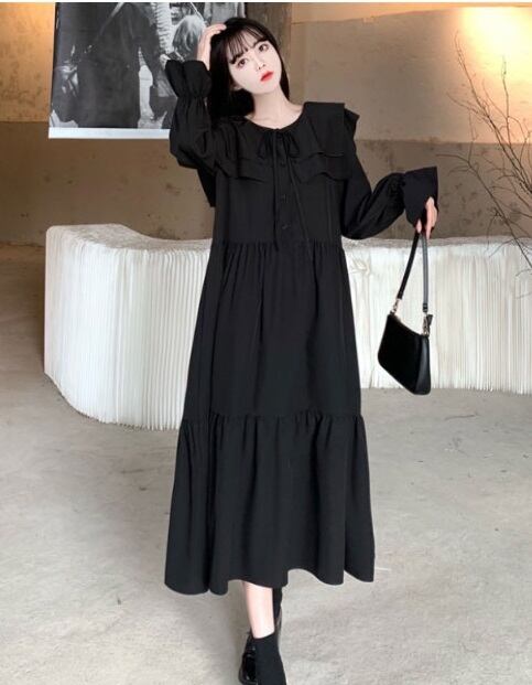 ティアードワンピース ワンピース 膝下 ロング ロング丈 袖あり 長袖 キャンディスリーブ クルーネック フリル襟 ティアード リボン かわいい おとなかわいい 大人 おしゃれ お洒落 大人可愛い 大人女子 キュート ガーリー 無地 秋 冬 10代 20代 レディース 女性用 学生 通学 デート お出かけ 女子会 ファッション コーデ スタイル モテ 体系カバー サイズ L XL 2XL 3XL 4XL ゆったり ゆる 色展開 黒 ブラック カーキ | ATAOI
