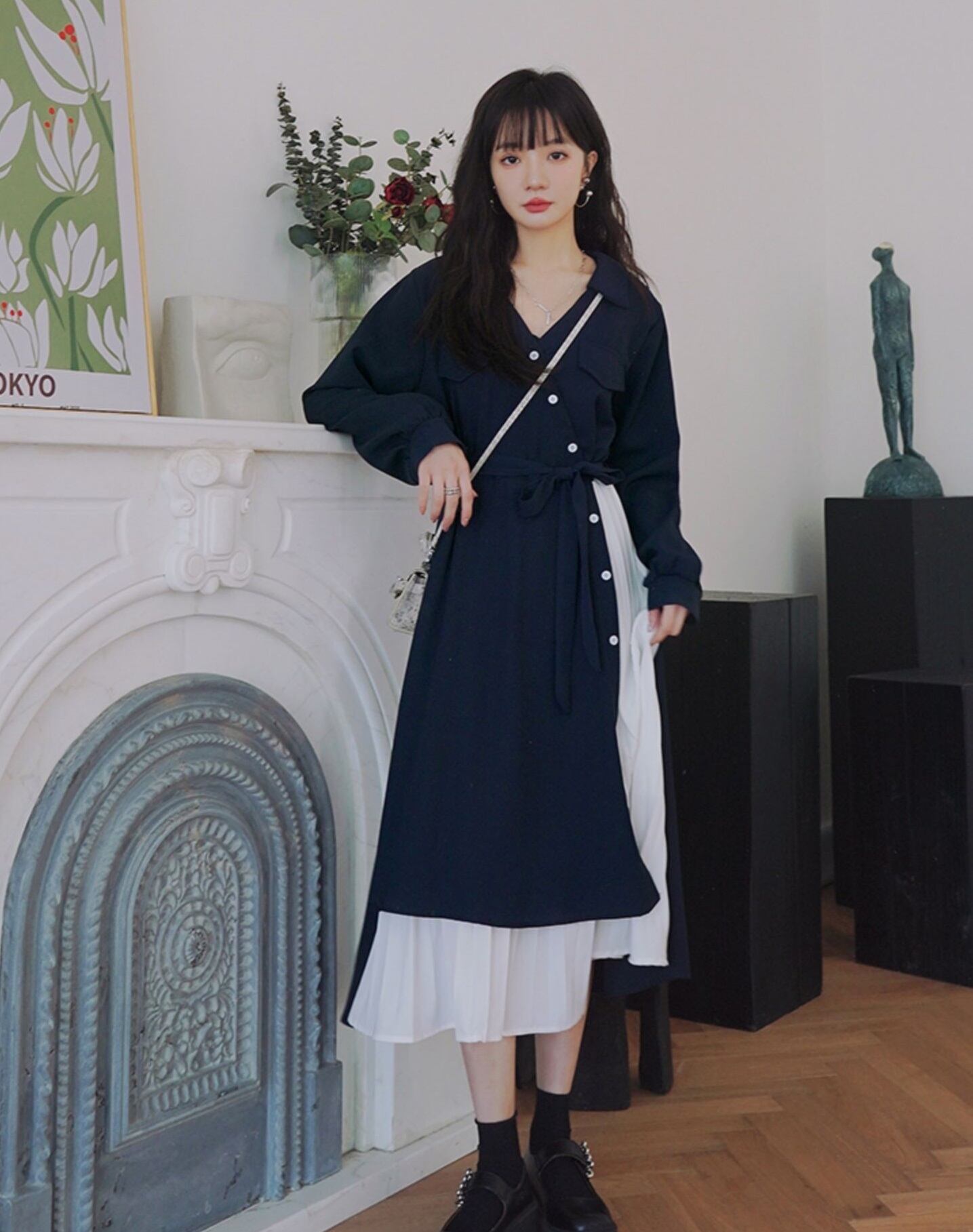 レイヤード風ワンピース ワンピース シャツワンピース 膝下 ロング ロング丈 袖あり 長袖 Vネック フレア シフォン ウエストマーク かわいい おとなかわいい おしゃれ お洒落 大人可愛い 大人女子 ガーリー 無地 春 秋 10代 20代 レディース 女性用 学生 通学 デート お出かけ ファッション コーデ スタイル サイズ S M L XL 白 ホワイト 黒 ブラック バイカラー モノトーン | ATAOI