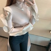 袖のフリルがキュートで個性的なハイネックオフショルダーリブセーターです。