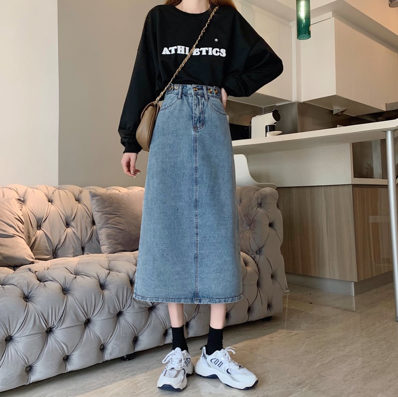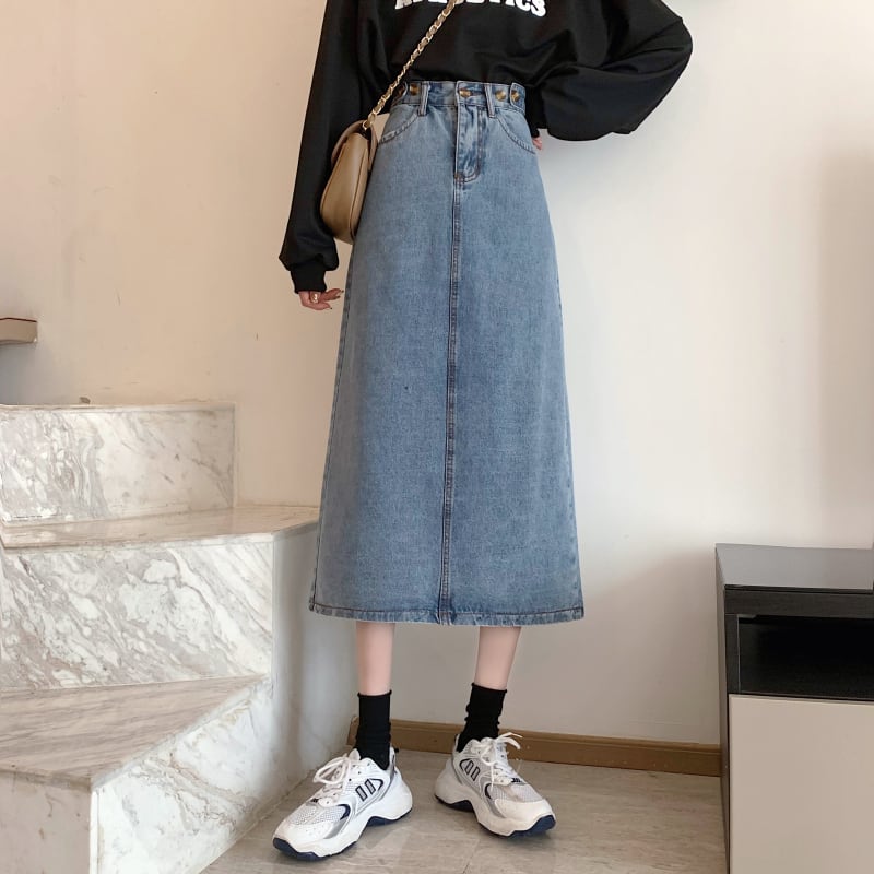 デニム スカート 膝下 ミモレ ミモレ丈 ストレート ハイウエスト バックスリット スリット かわいい おとなかわいい シンプル カジュアル おしゃれ お洒落 大人可愛い 大人女子 無地 春 夏 秋 冬 オールシーズン シーズンレス 10代 20代 30代 40代 レディース 女性用 学生 通学 デート お出かけ 女子会 休日 着回し 普段使い ファッション コーデ スタイル デイリー サイズ XXS XS S M L 小さいサイズ ライトブルー | ATAOI