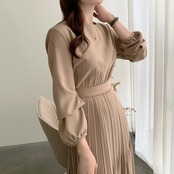 ワンピース 袖あり 長袖 ロング ロング丈 膝下 ラウンドネック プリーツ ウエストマーク ハイウエスト Aライン かわいい おとなかわいい きれいめ 大人 上品 おしゃれ お洒落 大人可愛い 大人女子 無地 春 夏 20代 30代 40代 レディース 女性用 通勤 デート お出かけ 女子会 ファッション コーデ スタイル モテ サイズ フリーサイズ 色展開 ブラウン ブラック | ATAOI