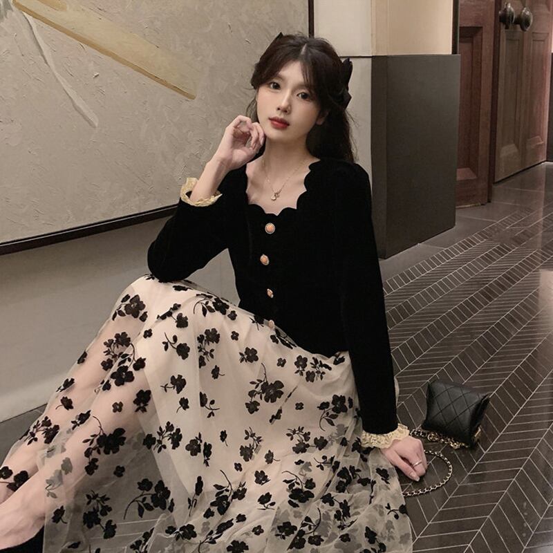 ツーピース お呼ばれコーデ ママコーデ ブラック トップス スカート ボトムス 羽織り フレアスカート ミモレ丈 ロング 袖あり 長袖 ラウンドネック 襟なし フレア ハイウエスト 透け感 裏地 ニット 上下セット 2点セット お得 セットアップ かわいい 大人可愛い きれいめ 大人 上品 おしゃれ お洒落 清楚 大人女子 ラブリー キュート エレガント 存在感 爽やか スマート 柄 花柄 小花柄 フラワー 春 秋 入学式 入園式 卒業式 卒園式 20代 30代 40代 レディース 女性用 ママ デート | ATAOI