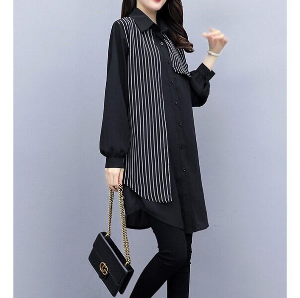 ワンピース シャツワンピース 膝上 膝上丈 袖あり 長袖 シャツ襟 異素材ミックス アシンメトリー ストライプ 前開き かわいい 大人可愛い きれいめ おしゃれ 清楚 大人女子 ラブリー キュート 爽やか 春 夏 秋 ロングシーズン 10代 20代 30代 40代 レディース 女性用 OL 学生 デート お出かけ 女子会 普段使い 重ね着 脚長 オルチャンファッション カジュアルコーデ スタイル 大きいサイズ L XL 2XL 3XL 4XL 5XL ブラック | ATAOI
